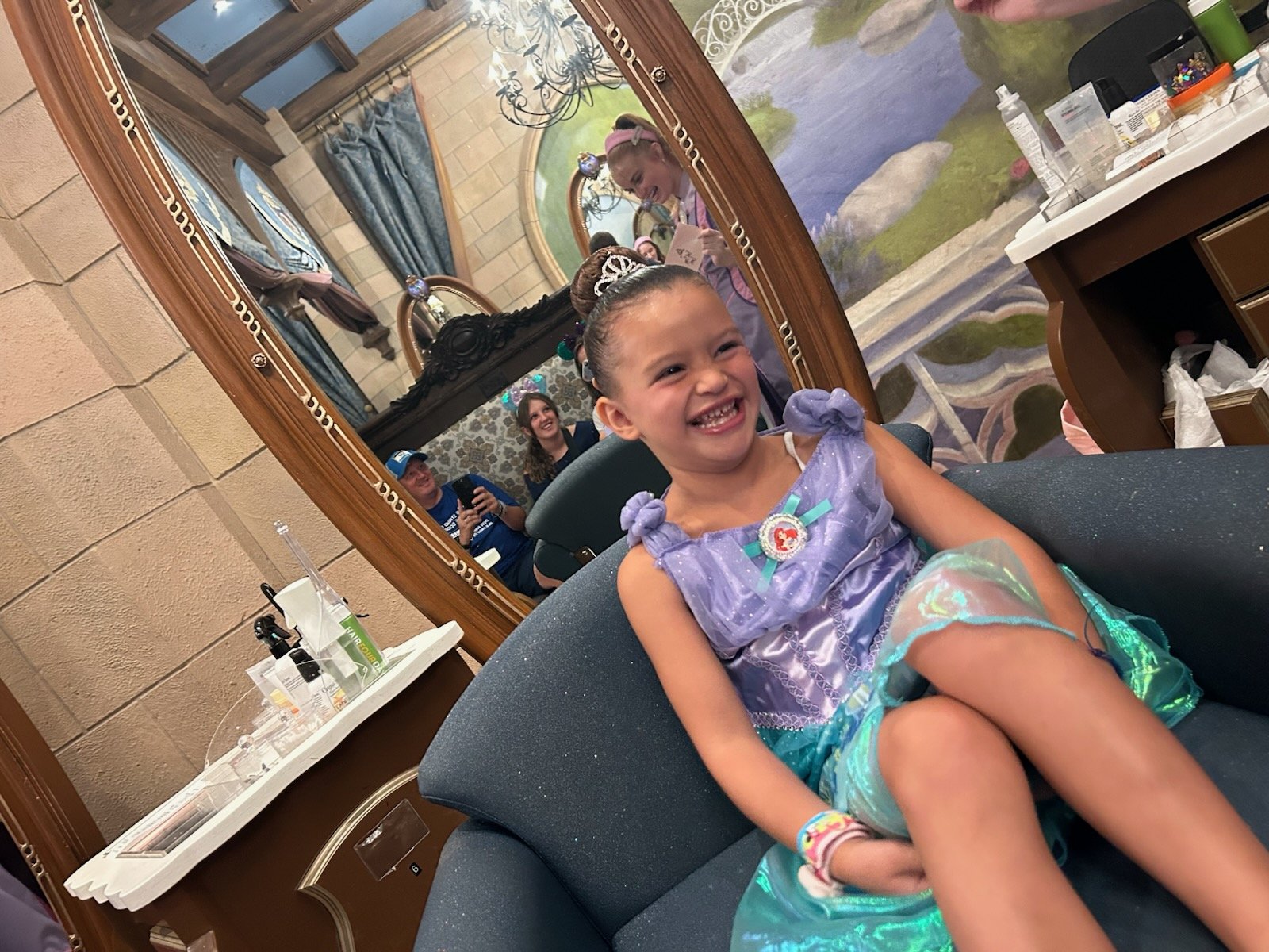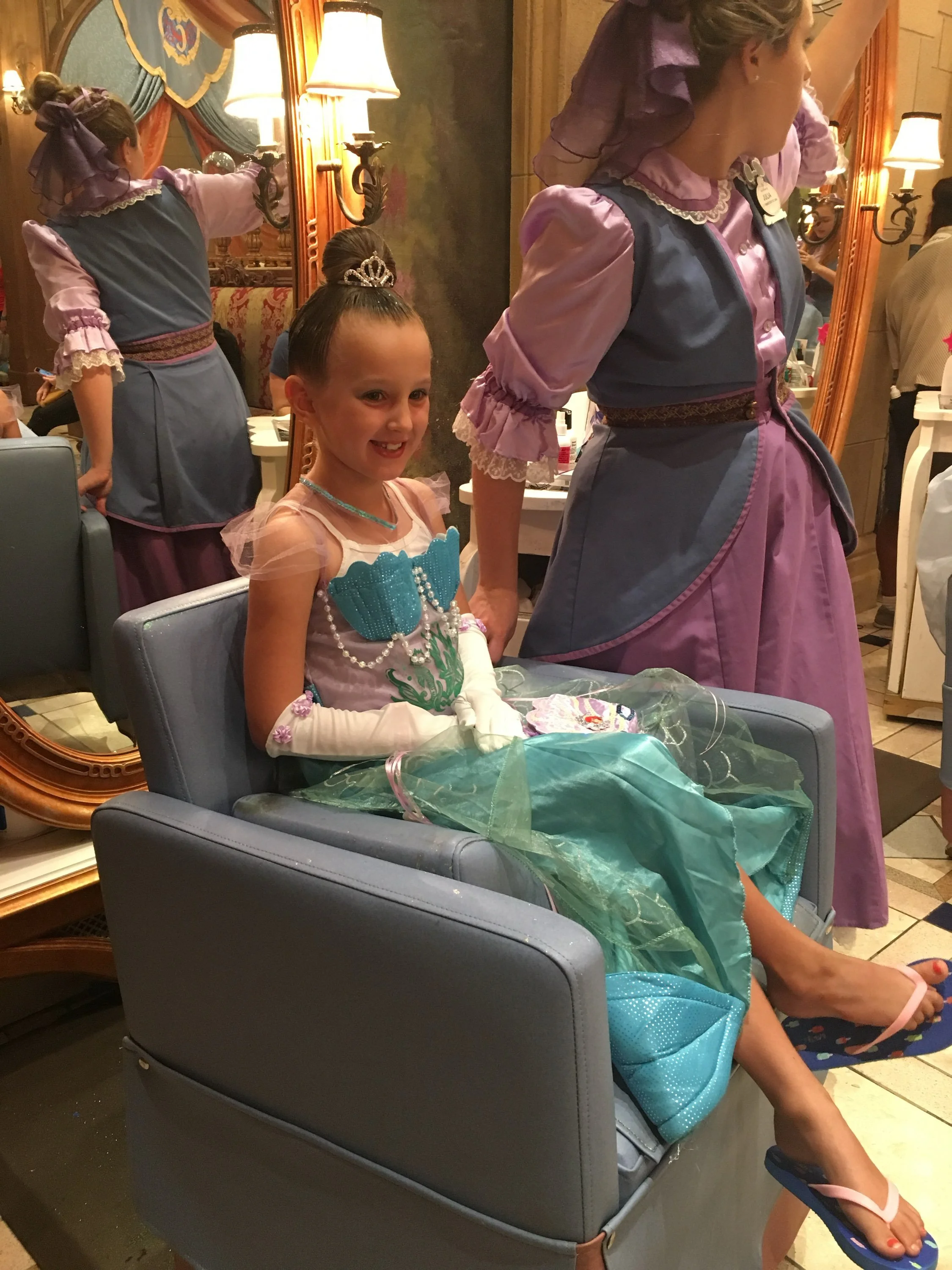 On our second trip at six, we brought an Elsa dress we purchased at home. She chose a more refined hair style and treated the experience like she was a real princess. This felt like the experience where she believed in the magic of it all.